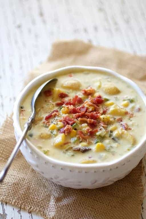 Roasted Poblano Corn and Potato Chowder with Bacon and Gouda Cheese is total comfort in a bowl!  This creamy chowder with smoky Poblano peppers, sweet corn, buttery Yukon gold potatoes, smoky bacon and Gouda cheese needs to be your go-to this fall and winter!