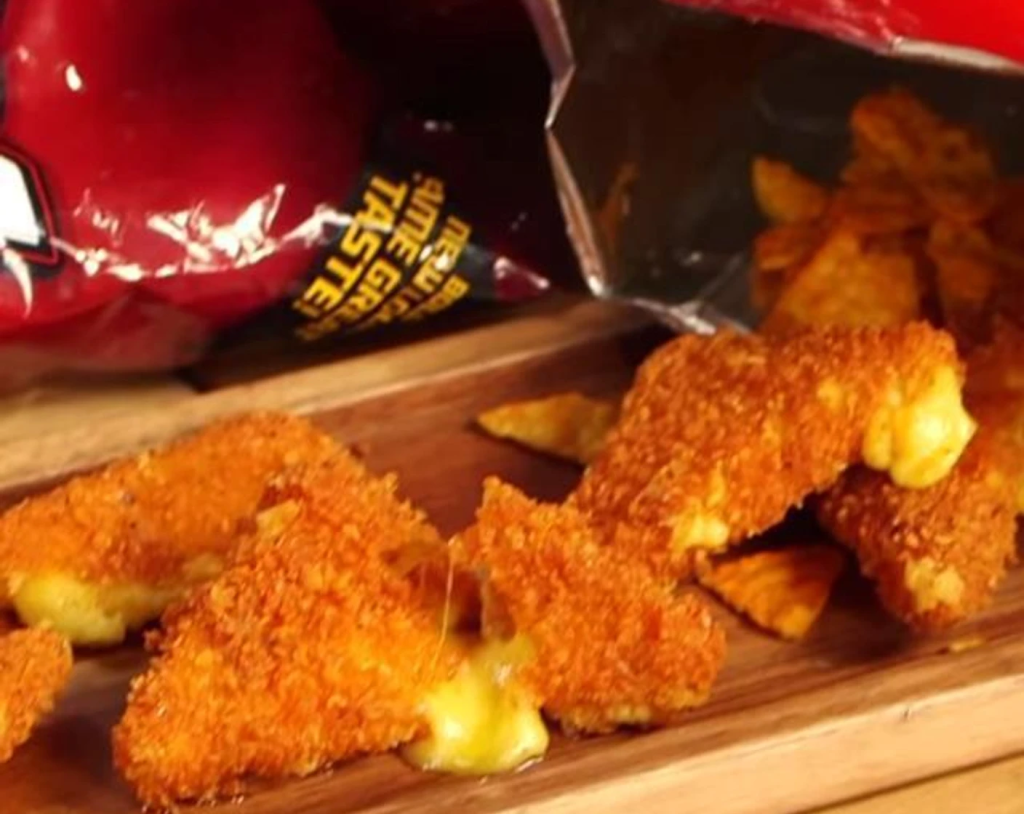 - Place Dorito covered cheese triangles in the oil for 1-2 minutes or until they are lightly browned. (Do not over cook or cheese will melt out.) Remove with slotted spoon and place on a paper towel to soak up excess grease.