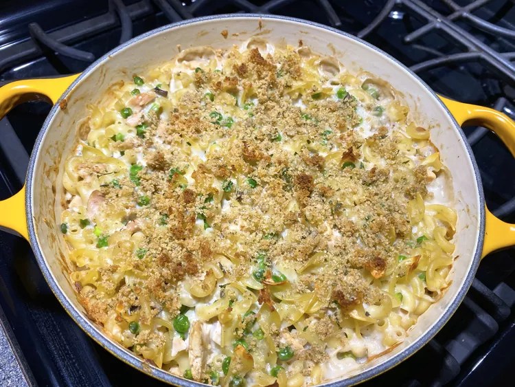 This tuna noodle casserole uses condensed cream of mushroom soup to flavor a creamy sauce that is mixed with tuna, egg noodles, and peas, topped with a crunchy bread crumb topping, and baked to perfection.
